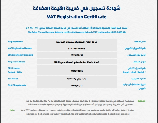 The Zakat, Tax and Customs Authority certifies that taxpayer below is VAT registered on 16/07/2023 AD